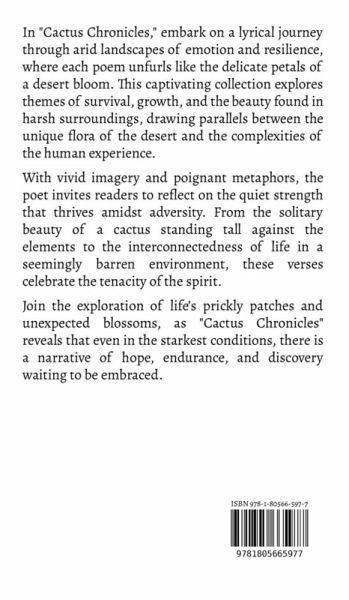 In "Cactus Chronicles," embark on a lyrical journey through arid landscapes of emotion and resilience, where each poem unfurls like the delicate petals of a desert bloom. This captivating collection explores themes of survival, growth, and the beauty found in harsh surroundings, drawing parallels between the unique flora of the desert and the complexities of the human experience. With vivid imagery and poignant metaphors, the poet invites readers to reflect on the quiet strength that thrives amidst adversity. From the solitary beauty of a cactus standing tall against the elements to the interconnectedness of life in a seemingly barren environment, these verses celebrate the tenacity of the spirit. Join the exploration of life's prickly patches and unexpected blossoms, as "Cactus Chronicles" reveals that even in the starkest conditions, there is a narrative of hope, endurance, and discovery waiting to be embraced.