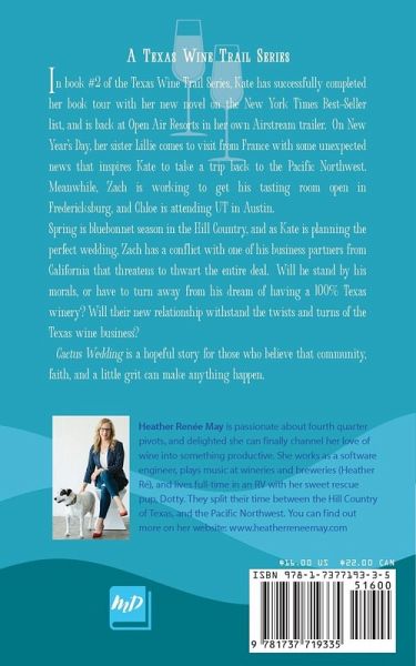 The Texas Wine Trail Series is a unique fiction series set in real places on the Texas Wine Trail. In book #1, Cactus Christmas, readers were introduced to Fredericksburg, Texas and 14 wineries on the wine trail. In book #2, Cactus Wedding, the readers will go deeper into the business of Texas winemaking, while continuing the story of the original characters. In book #2 of the Texas Wine Trail Series, Kate has successfully completed her book tour with her new novel on the New York Times Best-Seller list, and is back at Open Air Resorts in her own Airstream trailer. On New Year's Day, her sister Lillie comes to visit from France with some unexpected news that inspires Kate to take a trip back to the Pacific Northwest. Meanwhile, Zach is working to get his tasting room open in Fredericksburg, and Chloe is attending UT in Austin. Spring is bluebonnet season in the Hill Country, and as Kate is planning the perfect wedding, Zach has a conflict with one of his business partners from California that threatens to thwart the entire deal. Will he stand by his morals, or have to turn away from his dream of having a 100% Texas winery? Will their new relationship withstand the twists and turns of the Texas wine business? Cactus Wedding is a hopeful story for those who believe that community, faith, and a little grit can make anything happen.