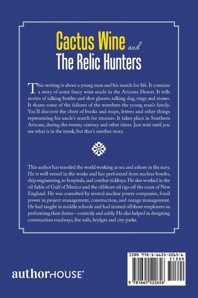 This writing is about a young man and his search for life. It contains a story of some fancy wine made in the Arizona Desert. It tells stories of talking bottles and shot glasses, talking dog, rings and stones. It shares some of the failures of the members the young man's family. You'll discover the chest of books and maps, letters and other things representing his uncle's search for treasure. It takes place in Southern Arizona, during the twenty century and other times. Just wait until you see what is in the trunk, but that's another story.