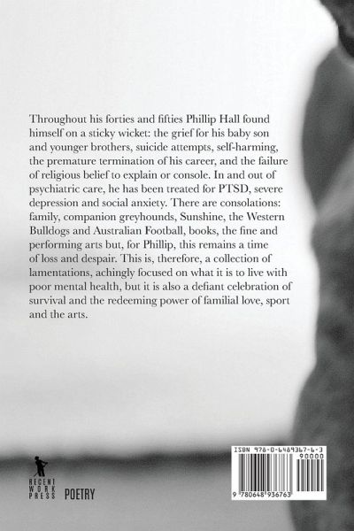 Throughout his forties and fifties Phillip found himself on a sticky wicket: the grief for his baby son and younger brothers, suicide attempts, self-harming, the premature termination of his career, and the failure of religious belief to explain or console. In and out of psychiatric care, he has been treated for PTSD, severe depression and social anxiety. There are consolations: family, companion greyhounds, Sunshine, the Western Bulldogs and Australian Football, books, the fine and performing arts but, for Phillip, this remains a time of loss and despair. This is, therefore, a collection of lamentations, achingly focused on what it is to live with poor mental health, but it is also a defiant celebration of survival and the redeeming power of familial love, sport and the arts.