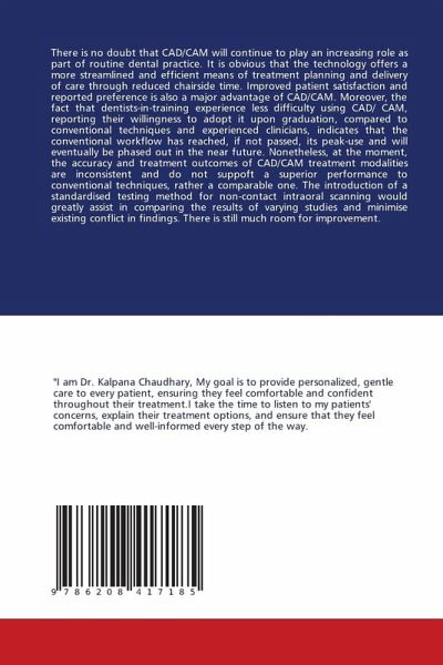 There is no doubt that CAD/CAM will continue to play an increasing role as part of routine dental practice. It is obvious that the technology offers a more streamlined and efficient means of treatment planning and delivery of care through reduced chairside time. Improved patient satisfaction and reported preference is also a major advantage of CAD/CAM. Moreover, the fact that dentists-in-training experience less difficulty using CAD/ CAM, reporting their willingness to adopt it upon graduation, compared to conventional techniques and experienced clinicians, indicates that the conventional workflow has reached, if not passed, its peak-use and will eventually be phased out in the near future. Nonetheless, at the moment, the accuracy and treatment outcomes of CAD/CAM treatment modalities are inconsistent and do not suppoft a superior performance to conventional techniques, rather a comparable one. The introduction of a standardised testing method for non-contact intraoral scanning would greatly assist in comparing the results of varying studies and minimise existing conflict in findings. There is still much room for improvement.