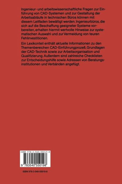Technische und arbeitswissenschaftliche Aspekte bei der Einführung von CAD-Systemen können mit diesen Entscheidungshilfen bewältigt werden. Ingenieurbüros, die die Beschaffung geeigneter Systeme planen, erhalten hiermit wertvolle Hinweise zur Vermeidung von teuren Fehlinvestitionen. Ein Lexikonteil zu aktuellen Fragen bei der Planung von CAD-Systemen wird ergänzt durch Adressen von Verbänden, Hinweisen zur Finanzierung und Checklisten zur Vorbereitung.
