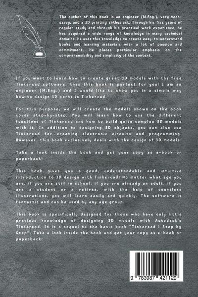 Important: If you do not have any previous knowledge about Tinkercad, you should first work through my basic book "Tinkercad - Step by Step". The general handling of Tinkercad is only repeated briefly at the beginning of this advanced 3D modeling book. If you want to learn how to create great 3D models with the free Tinkercad software, then this book is perfect for you! I am an engineer (M.Eng.) and I would like to show you in a simple way how to design 3D parts in Tinkercad. For this purpose, we will create the models shown on the book cover step-by-step. You will learn how to use the different functions of Tinkercad and how to build quite complex 3D models with it. In addition to designing 3D objects, you can also use Tinkercad for creating electronic circuits and programming. However, this book exclusively deals with the design of 3D models. Take a look inside the book and get your copy as e-book or paperback! This book gives you a good, understandable and intuitive introduction to 3D design with Tinkercad! No matter what age you are, if you are still in school, if you are already an adult, if you are a student or a retiree, with the help of countless illustrations, you will learn easily and quickly. The software is fantastic and can be used by any age group. After a short general introduction to the design process in Tinkercad, we will learn step by step and in detail through four practical example projects. This book is specifically designed for those who have only little previous knowledge of designing 3D models with Autodesk's Tinkercad. It is a sequel to the basic book "Tinkercad - Step by Step". The benefits of this book at a glance: - Step-by-step explanations on how to use the "3D Designs" section of Tinkercad by an engineer (Master of Engineering) - Hands-on learning with four great sample projects including step-by-step illustrations - Course content: Basics for creating 3D models in Tinkercad & four projects: Clothespin, Flashlight, Skateboard, Home & Garden. - An easy, simple & quick way to strengthen your 3D modeling skills in Tinkercad - Simple and easy to follow explanations. Suitable for kids, students, employees, tinkerers & inventors, retirees, and all ages - Learn everything important quickly. Compact and to the point on about 120 pages Take a look inside the book and get your copy.