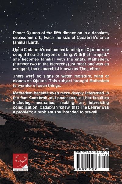 Planet Qjuunn of the fifth dimension is a desolate, sebaceous orb, twice the size of Cadabrah's once familiar Earth. Upon Cadabrah's exhausted landing on Qjuunn, she sought the aid of anyone or thing. With that "in mind," she becomes familiar with the entity, Mathedem, (number two in the hierarchy). Number one was an arrogant, toxic anarchist known as The Lehrer. There were no signs of water, moisture, wind or clouds on Qjuunn. This subject brought Mathedem to wonder of such things. Mathedem became even more deeply interested in the fact Cadabrah still possessed all her faculties including memories, making an interesting complication. Cadabrah 'knew' that The Lehrer was a problem; a problem she intended to prevail...