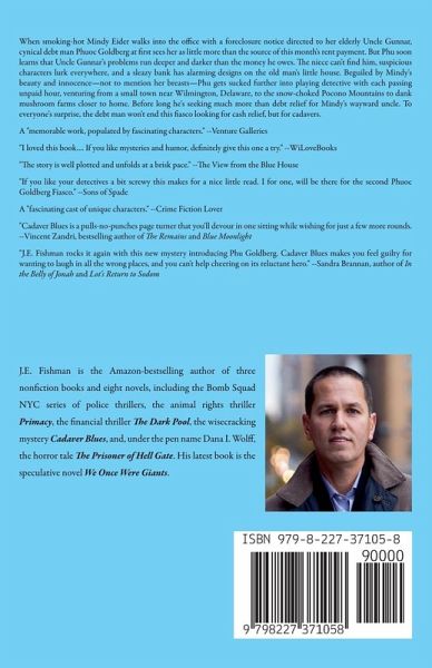 When smoking-hot Mindy Eider walks into the office with a foreclosure notice directed to her elderly Uncle Gunnar, cynical debt man Phuoc Goldberg at first sees her as little more than the source of this month's rent payment. But Phu soon learns that Uncle Gunnar's problems run deeper and darker than the money he owes. The niece can't find him, suspicious characters lurk everywhere, and a sleazy bank has alarming designs on the old man's little house. Beguiled by Mindy's beauty and innocence-not to mention her breasts-Phu gets sucked further into playing detective with each passing unpaid hour, venturing from a small town near Wilmington, Delaware, to the snow-choked Pocono Mountains to dank mushroom farms closer to home. Before long he's seeking much more than debt relief for Mindy's wayward uncle. To everyone's surprise, the debt man won't end this fiasco looking for cash relief, but for cadavers. A "memorable work, populated by fascinating characters." --Venture Galleries "I loved this book.... If you like mysteries and humor, definitely give this one a try." --WiLoveBooks "The story is well plotted and unfolds at a brisk pace." --The View from the Blue House "If you like your detectives a bit screwy this makes for a nice little read. I for one, will be there for the second Phuoc Goldberg Fiasco." --Sons of Spade A "fascinating cast of unique characters." --Crime Fiction Lover "Cadaver Blues is a pulls-no-punches page turner that you'll devour in one sitting while wishing for just a few more rounds. --Vincent Zandri, bestselling author of The Remains and Blue Moonlight "J.E. Fishman rocks it again with this new mystery introducing Phu Goldberg. Cadaver Blues makes you feel guilty for wanting to laugh in all the wrong places, and you can't help cheering on its reluctant hero." --Sandra Brannan, author of In the Belly of Jonah and Lot's Return to Sodom