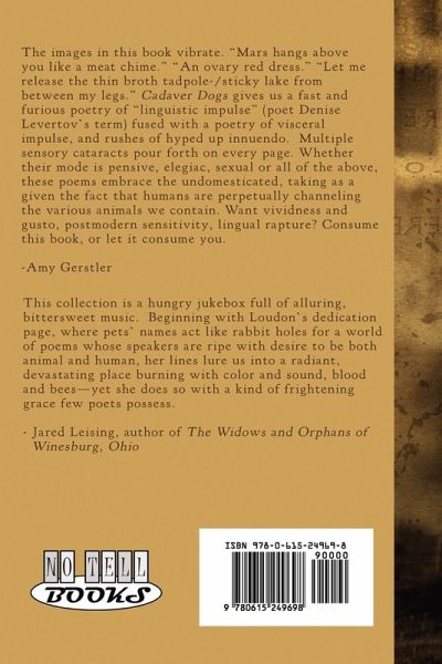 The images in this book vibrate. "Mars hangs above you like a meat chime." "An ovary red dress." "Let me release the thin broth tadpole-/sticky lake from between my legs." Cadaver Dogs gives us a fast and furious poetry of "linguistic impulse" (poet Denise Levertov's term) fused with a poetry of visceral impulse, and rushes of hyped up innuendo. Multiple sensory cataracts pour forth on every page. Whether their mode is pensive, elegiac, sexual or all of the above, these poems embrace the undomesticated, taking as a given the fact that humans are perpetually channeling the various animals we contain. Want vividness and gusto, postmodern sensitivity, lingual rapture? Consume this book, or let it consume you. -- Amy Gertsler