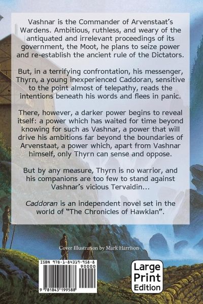 Vashnar is the Commander of Arvenstaat's Wardens. Ambitious, ruthless, and weary of the antiquated and irrelevant proceedings of its government, the Moot, he plans to seize power and reestablish the ancient rule of the Dictators. But, in a terrifying confrontation, his messenger, Thyrn, a young inexperienced Caddoran, sensitive to the point almost of telepathy, reads the intentions beneath his words and flees in panic. Accompanied by his uncle, three Wardens and Endryk, a shoreman, Thyrn is driven into the Karpas Mountains by Vashnar's relentless pursuit. There, however, a darker power begins to reveal itself: a power which has waited for time beyond knowing for such as Vashnar, a power that will drive his ambitions far beyond the boundaries of Arvenstaat, a power which, apart from Vashnar himself, only Thyrn can sense and oppose. But by any measure, Thyrn is no warrior, and his companions are too few to stand against Vashnar's vicious Tervaidin... Caddoran is an independent novel set in the world of "The Chronicles of Hawklan".