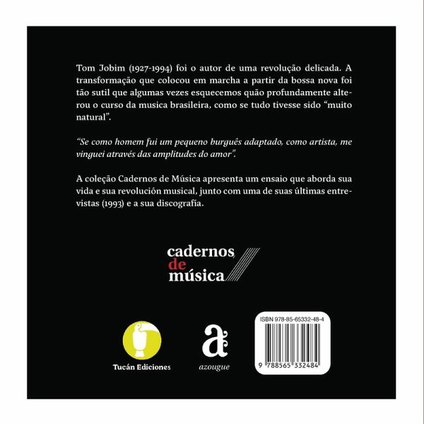 Tom Jobim (1927-1994) foi o autor de uma revolução delicada. A transformação que colocou em marcha a partir da bossa nova foi tão sutil que algumas vezes esquecemos quão profundamente alterou o curso da musica brasileira, como se tudo tivesse sido "muito natural". "Se como homem fui um pequeno burguês adaptado, como artista, me vinguei através das amplitudes do amor". A coleção Cadernos de Música apresenta um ensaio que aborda sua vida e sua revolución musical, junto com uma de suas últimas entrevistas (1993) e a sua discografía.
