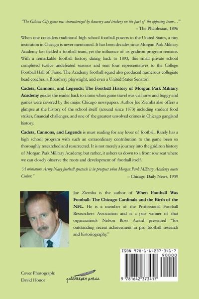 Digging deep into the intriguing past of football, Cadets, Cannons, and Legends: The Football History of Morgan Park Military Academy takes the reader back to a time when game travel was via train and horse-drawn carts and reporters from the major Chicago newspapers eagerly covered this violent, new sport. With professional football nowhere in sight, high school and college gridiron exploits captured the interest of local readers in the early part of the 20th century. With rare vintage photos, exhaustive research, and numerous personal interviews, author Joe Ziemba details the fascinating history of the Academy football program from its beginnings in 1893 through its final season as Morgan Park Military Academy in 1958. Brutal line play, travel challenges, wacky rivalries, and wildly supportive fan bases are all vividly captured in this glimpse into football’s often inglorious past. Although it has been decades since tiny Morgan Park Military Academy last fielded a football team, the influence of its gridiron program cannot be disregarded. This remarkable school on Chicago’s south side completed twelve undefeated seasons, sent four representatives to the College Football Hall of Fame, and often experienced difficulty scheduling games due to the powerful teams it sent out on the field. Yet, it rarely enrolled more than 200 students in its high school curriculum! Cadets, Cannons, and Legends provides new insight into the early days of high school football and recognizes the forgotten pioneers of what is now America’s favorite spectator sport. This fascinating book is not merely a journey into the gridiron history of Morgan Park Military Academy, but rather, it ushers us down to a front row seat where we can closely observe the roots of football itself.