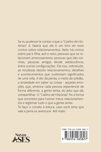 Falaria que o Cadins de Histórias é um livro de nove contos sobre relacionamentos. Nele, há contos sobre pai e filha, avô e neto, pessoas que se relacionam amorosamente, pessoas que são vizinhas, pessoas amigas desde adolescência, entre outras configurações. Ele traz, sobretudo, as miudezas destes relacionamentos, detalhes e acontecimentos que sustentam significados de uma vida. A dor da perda, o medo da solidão, a ansiedade em saber as coisas - aquelas emoções que, embora cada pessoa experiencie de forma diferente, a gente tenta, do jeito que dá, compartilhar. O Cadins de Histórias, ainda que ficcional, foi a forma que consegui compartilhar o que os relacionamentos significam, com o intuito de legitimar emoções. Você leria esses Cadins?