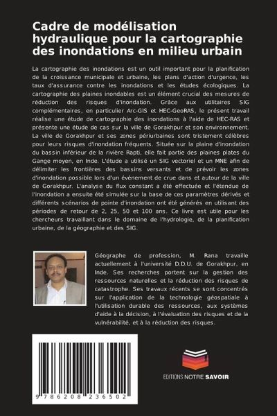 La cartographie des inondations est un outil important pour la planification de la croissance municipale et urbaine, les plans d'action d'urgence, les taux d'assurance contre les inondations et les études écologiques. La cartographie des plaines inondables est un élément crucial des mesures de réduction des risques d'inondation. Grâce aux utilitaires SIG complémentaires, en particulier Arc-GIS et HEC-GeoRAS, le présent travail réalise une étude de cartographie des inondations à l'aide de HEC-RAS et présente une étude de cas sur la ville de Gorakhpur et son environnement. La ville de Gorakhpur et ses zones périurbaines sont tristement célèbres pour leurs risques d'inondation fréquents. Située sur la plaine d'inondation du bassin inférieur de la rivière Rapti, elle fait partie des plaines plates du Gange moyen, en Inde. L'étude a utilisé un SIG vectoriel et un MNE afin de délimiter les frontières des bassins versants et de prévoir les zones d'inondation possible lors d'un événement de crue dans et autour de la ville de Gorakhpur. L'analyse du flux constant a été effectuée et l'étendue de l'inondation a ensuite été simulée sur la base de ces paramètres dérivés et différents scénarios de pointe d'inondation ont été générés en utilisant des périodes de retour de 2, 25, 50 et 100 ans. Ce livre est utile pour les chercheurs travaillant dans le domaine de l'hydrologie, de la planification urbaine, de la géographie et des SIG.