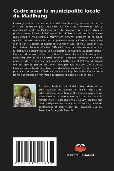L'ouvrage met l'accent sur la nécessité d'une bonne gouvernance et sur le rôle du leadership pour souligner les difficultés rencontrées par la municipalité locale de Madibeng dans la fourniture de services dans la province du Nord-Ouest de l'Afrique du Sud. L'objectif était de créer un cadre qui aiderait la municipalité à fournir des services efficaces et de haute qualité. Une méthode de recherche qualitative a été utilisée et l'étude a été menée dans le canton de Letlhabile, quartier 9. Les résultats indiquent que les principaux facteurs affectant l'efficacité de la prestation de services sont le manque de gestionnaires et de dirigeants compétents et expérimentés, l'absence de responsabilité en matière de fraude financière, le manque de leadership efficace et de gestion dévouée, ainsi que l'absence d'allocation adéquate des ressources. Les principes Batho-Pele et l'éthique du travail ont été ignorés par le personnel municipal. Ces observations aideront l'administration locale à obtenir la satisfaction du client en améliorant la prestation de services. L'étude se termine par la présentation d'un cadre de travail susceptible de remédier aux lacunes de l'administration locale.