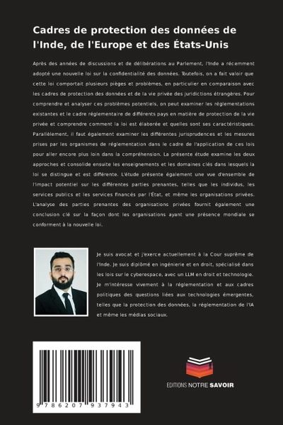 Après des années de discussions et de délibérations au Parlement, l'Inde a récemment adopté une nouvelle loi sur la confidentialité des données. Toutefois, on a fait valoir que cette loi comportait plusieurs pièges et problèmes, en particulier en comparaison avec les cadres de protection des données et de la vie privée des juridictions étrangères. Pour comprendre et analyser ces problèmes potentiels, on peut examiner les réglementations existantes et le cadre réglementaire de différents pays en matière de protection de la vie privée et comprendre comment la loi est élaborée et quelles sont ses caractéristiques. Parallèlement, il faut également examiner les différentes jurisprudences et les mesures prises par les organismes de réglementation dans le cadre de l'application de ces lois pour aller encore plus loin dans la compréhension. La présente étude examine les deux approches et consolide ensuite les enseignements et les domaines clés dans lesquels la loi se distingue et est différente. L'étude présente également une vue d'ensemble de l'impact potentiel sur les différentes parties prenantes, telles que les individus, les services publics et les services financés par l'État, et même les organisations privées. L'analyse des parties prenantes des organisations privées fournit également une conclusion clé sur la façon dont les organisations ayant une présence mondiale se conforment à la nouvelle loi.