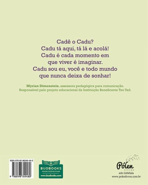 Cadu é um menino muito imaginativo, que vive no mundo da Lua, nunca presta atenção nos chamados de sua mãe e nem mesmo nas aulas por estar sempre criando mundos. O que ele queria ser quando crescesse? Inventor! Mas não um inventor qualquer. Inventor de pessoas. Cadu e o mundo que não era é o terceiro livro da dupla Lúcio Goldfarb e Pedro Menezes e conta a história de todas as pessoas criativas e que não desistem de sonhar. Os dois livros anteriores, Joãozinho Quero-quero e Urso Alfredo e o mistério na neve, também foram editados pela Pólen Livros.