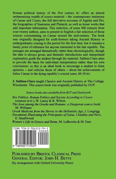 Roman political history of the first century BC offers an almost embarrassing wealth of source material -- the contemporary testimony of Caesar and Cicero, the full derivative accounts of Appian and Dio, the biographies of Suetonius and Plutarch, to name but a few. This selection, of some 400 extracts from over twenty authors, presents in English translation a fair selection of those sources concentrating on Caesar around the mid-century. The passages are arranged thematically rather than chronologically, and introductions and interpolation guide the student through the material. This is an ideal book to encourage a student to form opinions -- and criticise those of others -- about the achievements of Julius Caesar in the dying Republic's crucial years, 60-50 BC. Using his own translations throughout, James Sabben-Clare here weaves together four hundred excerpts from twenty classical sources plus inscriptions and late authors such as Jordanes to capture the critical decade 60-50 BC. The book captures the intense vitality of the source material, moving in steady chronological progression to produce a rich portrayal of the complex political scene.