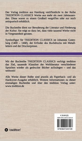 Diese Hardcover-Ausgabe ist Teil der TREDITION CLASSICS. Der Verlag tredition aus Hamburg veröffentlicht in der Buchreihe TREDITION CLASSICS Werke aus mehr als zwei Jahrtausenden. Diese waren zu einem Großteil vergriffen oder nur noch antiquarisch erhältlich. Mit TREDITION CLASSICS verfolgt tredition das Ziel, tausende Klassiker der Weltliteratur verschiedener Sprachen wieder als gedruckte Bücher zu verlegen und das weltweit! Die Buchreihe dient zur Bewahrung der Literatur und Förderung der Kultur. Sie trägt so dazu bei, dass viele tausend Werke nicht in Vergessenheit geraten.