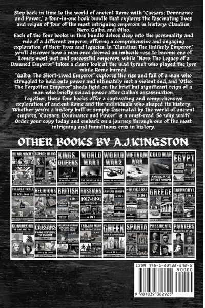 Step back in time to the world of ancient Rome with "Caesars: Dominance and Power," a four-in-one book bundle that explores the fascinating lives and reigns of four of the most intriguing emperors in history: Claudius, Nero, Galba, and Otho. Each of the four books in this bundle delves deep into the personality and rule of a different emperor, offering a comprehensive and engaging exploration of their lives and legacies. In "Claudius: The Unlikely Emperor," you'll discover how a man once deemed an imbecile rose to become one of Rome's most just and successful emperors, while "Nero: The Legacy of a Damned Emperor" takes a closer look at the mad tyrant who played the lyre while Rome burned. "Galba: The Short-Lived Emperor" explores the rise and fall of a man who struggled to hold onto power and ultimately met a violent end, and "Otho: The Forgotten Emperor" sheds light on the brief but significant reign of a man who briefly seized power after Galba's assassination. Together, these four books offer a captivating and comprehensive exploration of ancient Rome and the individuals who shaped its history. Whether you're a history buff or simply fascinated by the world of ancient empires, "Caesars: Dominance and Power" is a must-read. So why wait? Order your copy today and embark on a journey through one of the most intriguing and tumultuous eras in history.