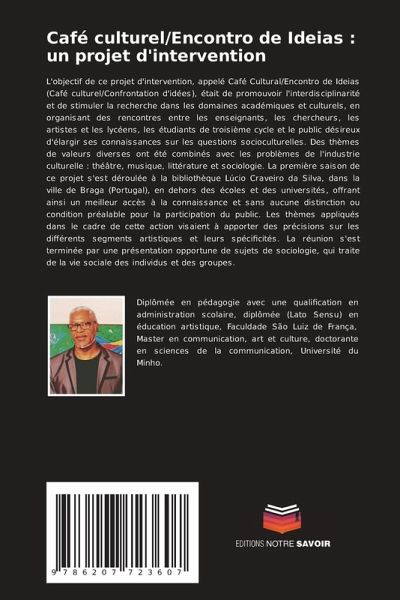 L'objectif de ce projet d'intervention, appelé Café Cultural/Encontro de Ideias (Café culturel/Confrontation d'idées), était de promouvoir l'interdisciplinarité et de stimuler la recherche dans les domaines académiques et culturels, en organisant des rencontres entre les enseignants, les chercheurs, les artistes et les lycéens, les étudiants de troisième cycle et le public désireux d'élargir ses connaissances sur les questions socioculturelles. Des thèmes de valeurs diverses ont été combinés avec les problèmes de l'industrie culturelle : théâtre, musique, littérature et sociologie. La première saison de ce projet s'est déroulée à la bibliothèque Lúcio Craveiro da Silva, dans la ville de Braga (Portugal), en dehors des écoles et des universités, offrant ainsi un meilleur accès à la connaissance et sans aucune distinction ou condition préalable pour la participation du public. Les thèmes appliqués dans le cadre de cette action visaient à apporter des précisions sur les différents segments artistiques et leurs spécificités. La réunion s'est terminée par une présentation opportune de sujets de sociologie, qui traite de la vie sociale des individus et des groupes.