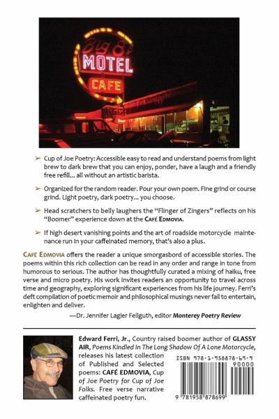Welcome to The Essential CAFÉ EDMOVIA, Cup of Joe poetry for Cup of Joe folks. A poetry book of over 60 published poems plus another 100+ selected poems of informal poetry that is accessible, approachable, easy to read and enjoy. Some haiku and micro poems to start but mostly free verse "Cup of Joe" narrative memoir style poems that tell a story or capture a vignette of life that you, the reader, can identify with, easily visualize and imagine or could have happened to you. You will not find formal poetry like sonnets, villanelles, limericks or a math sheet sestina at the CAFÉ EDMOVIA. If that is what you are looking for, may I suggest you consider a trip up to Highbrow Town to get a 'Highbucks' experience where a latte foam art barista can assist you with poetic feet, syllable count, line length, meter and rhyme, etc. That poetry is fulfilling and satisfying for some, but if you want to sit back, select your own "Cup of Joe" poem with a full pot of friendly refills written for the masses of "Cup of Joe" regular grind folks, CAFÉ EDMOVIA is the place for you. Come on in, relax and pour yourself a down to earth "Cup of Joe" poem, light or strong, short or long. No degree in English literature, philosophy or a Master of Fine Arts (MFA) degree in poetry required for admittance to CAFÉ EDMOVIA. If you have a motorcycle or the desire to acquire one and "two lane" the USA, or savor the memories of having done so, you will enjoy your stay at the CAFÉ EDMOVIA. Having grown up as a "Boomer" in the country on a "non-profit" farm, aka "a farm that never made a profit", will also enhance your stay. For the Random Reader: The poems in CAFÉ EDMOVIA are organized and arranged with the "random reader" in mind featuring the RANDOM READER ORGANIZATIONAL METHOD (RROM). The RROM has been developed specifically for CAFÉ EDMOVIA and it has two easy key features: Feature One: Poems are arranged from short to long, front to back, to help the random reader quickly find a poem that he or she has time to read. Feature Two: To avoid any contrasting levity, mood and/or tone conflict between adjacent poems and assist the random reader in selecting a poem tone they prefer, there are coffee cup symbols placed above the title of each titled poem. The levity of titled poems is indicated with 1 to 5 coffee cup symbols. One cup = meant to be funny, five cups= meant to be serious. Simple, easy and helpful to the random reader. Cup of Joe Poetry: Accessible easy to read and understand poems from light brew to dark brew that you can enjoy, ponder, have a laugh and a friendly free refill... all without a barista to explain everything. Poems organized for the random reader. Pour your own poem. Fine grind or course grind. Light poetry, dark poetry... you choose. Head scratchers to belly laughers the "Flinger of Zingers" author reflects on his "Boomer" experience down at the CAFÉ EDMOVIA. If high desert vanishing points and the art of roadside motorcycle maintenance run in your caffeinated blood, that's a plus. HUMOR: Have some, it will help. Enjoy the Easter Eggs... if you spot them.