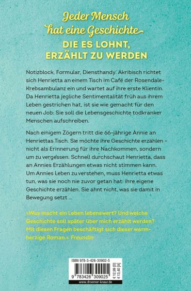 Die 32-jährige Henrietta Lockwood führt in Birmingham ein zurückgezogenes Leben mit ihrem Hund Dave. Schon früh hat sie eine Mauer zwischen sich und der Welt errichtet. Das verhilft ihr schließlich zu einem besonderen Job im Hospiz, bei dem man besser nicht ständig in Tränen ausbricht: Henrietta soll todkranken Menschen dabei helfen, die Geschichte ihres Lebens für die Nachwelt aufzuschreiben. Schon bei den ersten Gesprächen mit ihrer Klientin Annie merkt Henrietta, dass die 65-jährige Krebspatientin schlimmen Erinnerungen ausweicht. Ohne die wird ihre Geschichte jedoch nie vollständig sein, und das kann Henrietta nicht hinnehmen. Sie versucht auf eigene Faust herauszufinden, was Annies Schwester vor 46 Jahren zugestoßen ist. Doch umAnnie dazu zu bringen, alle Puzzleteile offenzulegen, muss Henrietta etwas tun, was sie noch nie zuvor getan hat: ihre eigene Geschichte erzählen.