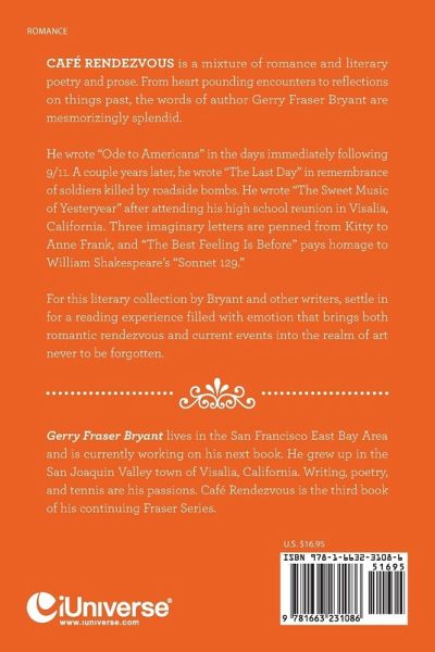 Café Rendezvous is a mixture of romance and literary poetry and prose. From heart pounding encounters to reflections on things past, the words of author Gerry Fraser Bryant are mesmorizingly splendid. He wrote "Ode to Americans" in the days immediately following 9/11. A couple years later, he wrote "The Last Day" in remembrance of soldiers killed by roadside bombs. He wrote "The Sweet Music of Yesteryear" after attending his high school reunion in Visalia, California. Three imaginary letters are penned from Kitty to Anne Frank, and "The Best Feeling Is Before" pays homage to William Shakespeare's "Sonnet 129." For this literary collection by Bryant and other writers, settle in for a reading experience filled with emotion that brings both romantic rendezvous and current events into the realm of art never to be forgotten.