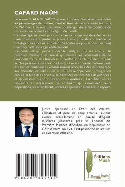 Le roman "CAFARD NAÜM" essaie, à travers l'amitié existant entre les personnages de Brahma, Thot et Ares, de faire ressortir les maux de l'Afrique, à travers une satire sociale qui vire à l'autocritique du marasme que connaît cette région du monde.Cet ouvrage ne vient pas contredire ceux qui ont déjà décrié ces tares, mais veut apporter sa pierre à une prise de conscience de l'intelligentsia africaine et partant de toutes les populations qui n'ont que trop parlé, sans agir véritablement.Ce continent qui peine à décoller, malgré tous ses atouts. Un parcours initiatique et amical qui revisite les vicissitudes de ce continent ''terre des hommes'' et ''malheur de l'humanité''. L'auteur semble pessimiste mais loin de l'être, il tire la sonnette d'alarme pour éveiller les consciences volontairement amorphes des Africains face aux thématiques telles que le sous-développement, l'immigration choisie, la fuite des cerveaux, le diktat des nations dites développées et impérialistes qui sont des notions exportées ; il n'oublie pas ces dirigeants et intellectuels du continent qui asservissent leurs populations, les affaiblissent, jusqu'à ce qu'elles n'aient aucun espoir!