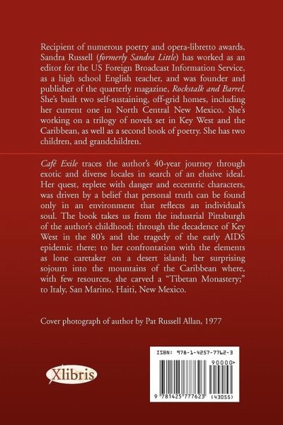 Without building skills, money, or a knowledge of West Indian culture, author Sandra Russell, with only a shovel and a miner¿s pick, embarked on a mission in the Caribbean that resulted in a 14-year project that threatened everything she held dear -- her family, her beliefs, her life. Recovery from this challenge taught her that the evolutionary capacity of the human spirit is limitless. This is one of many lessons readers will share as Xlibris releases Russell¿s inspiring new book, Cafe Exile. Cafe Exile features a lively series of writings that traces the author¿s forty-year odyssey, a journey through exotic places and uncommon dangers in a personal quest for truth. These writings combine the irony of the short story, the provocativeness of drama, the rigorous self-observation found in the best of memoirs, with the conciseness of the poem. A masterful blend and juxtaposition of literary elements, filled with insight, drama, and sly humor, this volume will stir your imagination and immerse you deep into the author¿s life. The book takes us from the industrial Pittsburgh of the author¿s childhood; through the decadence of Key West in the 80¿s and the tragedy of the early AIDS epidemic there; to her confrontation with the elements as a lone caretaker on a desert island 13 miles off the Florida Keys; her surprising sojourn into the mountains of the Caribbean where, with few resources, she carved a "Tibetan Monastery;" as well as to Italy, San Marino, Haiti, and finally, New Mexico.... Russell¿s travels, replete with danger, eccentric characters, and remarkable achievement, were driven by a belief that personal truth can be found only in an environment that reflects an individual¿s soul.