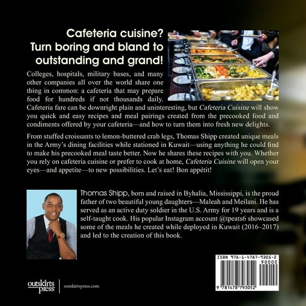 Cafeteria cuisine? Turn boring and bland to outstanding and grand! Colleges, hospitals, military bases, and many other companies all over the world share one thing in common: a cafeteria that may prepare food for hundreds if not thousands daily. Cafeteria fare can be downright plain and uninteresting, but Cafeteria Cuisine will show you quick and easy recipes and meal pairings created from the precooked food and condiments offered by your cafeteria-and how to turn them into fresh new delights. From stuffed croissants to lemon-buttered crab legs, Thomas Shipp created unique meals in the Army's dining facilities while stationed in Kuwait-using anything he could find to make his precooked meal taste better. Now he shares these recipes with you. Whether you rely on cafeteria cuisine or prefer to cook at home, Cafeteria Cuisine will open your eyes-and appetite-to new possibilities. Let's eat! Bon appétit!