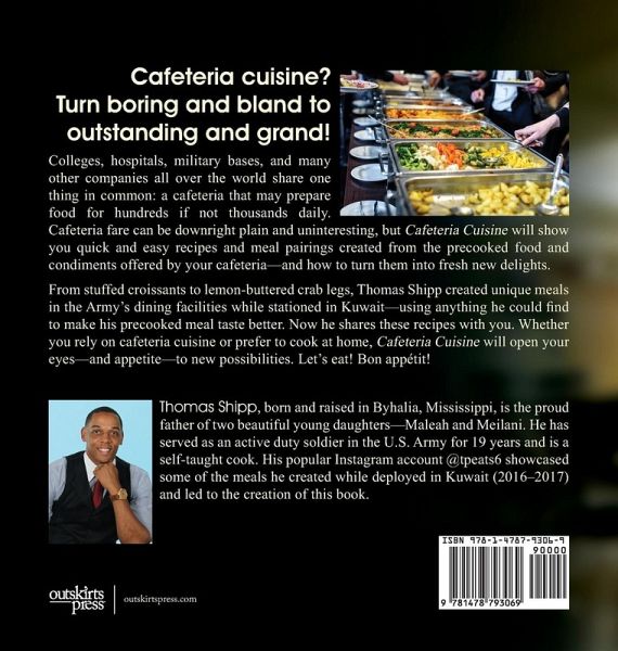 Cafeteria cuisine? Turn boring and bland to outstanding and grand! Colleges, hospitals, military bases, and many other companies all over the world share one thing in common: a cafeteria that may prepare food for hundreds if not thousands daily. Cafeteria fare can be downright plain and uninteresting, but Cafeteria Cuisine will show you quick and easy recipes and meal pairings created from the precooked food and condiments offered by your cafeteria-and how to turn them into fresh new delights. From stuffed croissants to lemon-buttered crab legs, Thomas Shipp created unique meals in the Army's dining facilities while stationed in Kuwait-using anything he could find to make his precooked meal taste better. Now he shares these recipes with you. Whether you rely on cafeteria cuisine or prefer to cook at home, Cafeteria Cuisine will open your eyes-and appetite-to new possibilities. Let's eat! Bon appétit!