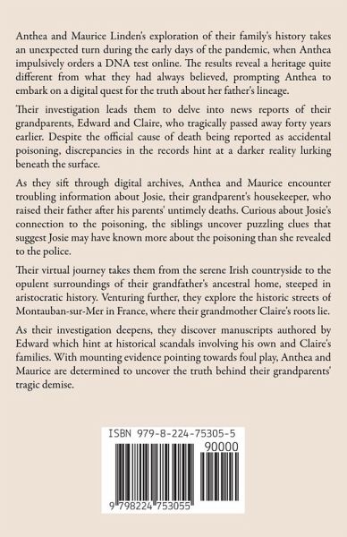 Anthea and Maurice Linden's exploration of their family's history takes an unexpected turn during the early days of the pandemic, when Anthea impulsively orders a DNA test online. The results reveal a heritage quite different from what they had always believed, prompting Anthea to embark on a digital quest for the truth about her father's lineage. Their investigation leads them to delve into news reports of their grandparents, Edward and Claire, who tragically passed away forty years earlier. Despite the official cause of death being reported as accidental poisoning, discrepancies in the records hint at a darker reality lurking beneath the surface. As they sift through digital archives, Anthea and Maurice encounter troubling information about Josie, their grandparent's housekeeper, who raised their father after his parents' untimely deaths. Curious about Josie's connection to the poisoning, the siblings uncover puzzling clues that suggest Josie may have known more about the poisoning than she revealed to the police. Their virtual journey takes them from the serene Irish countryside to the opulent surroundings of their grandfather's ancestral home, steeped in aristocratic history. Venturing further, they explore the historic streets of Montauban-sur-Mer in France, where their grandmother Claire's roots lie. As their investigation deepens, they discover manuscripts authored by Edward which hint at historical scandals involving his own and Claire's families. With mounting evidence pointing towards foul play, Anthea and Maurice are determined to uncover the truth behind their grandparents' tragic demise.