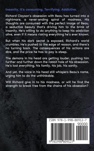 Madness. It's abysmal. Horrifying. Sublime. Richard Clayson is a slave to his addiction, the idea of Beau, the thought of beauty, so transparent and transcending, ingeniously in the form of a perfect person. A battle within, against the demon's voice in his head. However, what happens when someone exposes him? Now he's gone too far. Sunk far too low. Too deep in the mouth of the cave he cannot see the entrance. His life is ruined. If he could, he would stop the world from turning, the heavens from opening up and beaming sunlight down on them. He would stop his heart, his lungs, and all the creatures in the world just so that he would never ever have to meet Beau.
