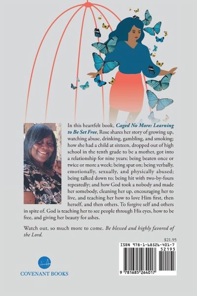 In this heartfelt book, Caged No More: Learning to Be Set Free, Rose shares her story of growing up, watching abuse, drinking, gambling, and smoking; how she had a child at sixteen, dropped out of high school in the tenth grade to be a mother, got into a relationship for nine years; being beaten once or twice or more a week; being spat on; being verbally, emotionally, sexually, and physically abused; being talked down to; being hit with two-by-fours repeatedly; and how God took a nobody and made her somebody, cleaning her up, encouraging her to live, and teaching her how to love Him first, then herself, and then others. To forgive self and others in spite of. God is teaching her to see people though His eyes, how to be free, and giving her beauty for ashes. Watch out, so much more to come. Be blessed and highly favored of the Lord.