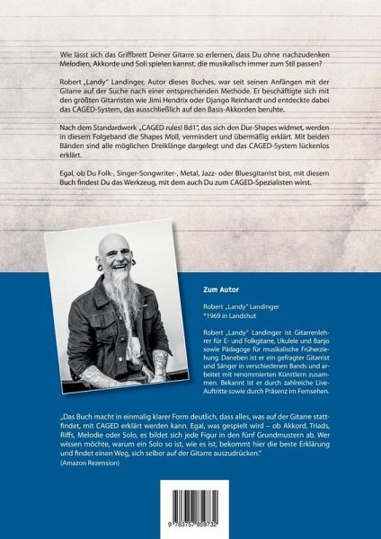 Das CAGED System Basic Buch Teil 2Wie lässt sich das Griffbrett der Gitarre so erlernen, dass man ohne Nachzudenken Melodien, Akkorde und Soli spielen kann, die musikalisch immer zum Stil passen? Robert Landy Landinger, Autor des Buches, war seit seinen Anfängen mit der Gitarre auf der Suche nach einer entsprechenden Methode. Er beschäftigte sich mit den größten Gitarristen wie Jimi Hendrix oder Django Reinhardt und entdeckte dabei das CAGED-System, das ausschließlich auf den Basis-Akkorden beruhte. Mit diesem Band gibt es jetzt erstmals ein Buch und eine Methode, mit dem jede/r, der die klassischen Akkorde auf der Gitarre beherrscht, schnell und mühelos dieses geniale System erlernen kann.Inhalt Band 2: - Die 5 Shapes C A G E D für Moll, Vermindert und Übermäßige Akkorde - genauer Aufbau der Akkorde- Mollpentatonik und Blues Tonleiter mit vielen interessanten Licks- Arpeggios für Moll, Vermindert, Übermäßig- natürlich Moll, Harmonisch Moll und Melodisch Moll Tonleitern- Pentatonik, Arpeggios und Tonleitern immer mit Bezug zum Shape- Stufenakkorde der C-Dur Tonleiter- Vergleich der Shapes Dur, Moll, Vermindert (dim), Übermäßig (aug)- Kadenzen in natürlich, Harmonisch und Melodisch MollSind diese verstanden und in den Fingern, beginnt der Spaß am Musizieren.Das Griffbrett und das Ohr gibt dir dann die Orientierung zum Rhythmus- oder Solospiel.Das Suchen auf der Gitarre hat hier ein Ende.CAGEDrules! Bd2 ist die ideale Ergänzung zu CAGEDrules! Bd1, in dem die Dur Shapes behandelt werden.Damit sind lückenlos alle Dreiklangsshapes erklärt.