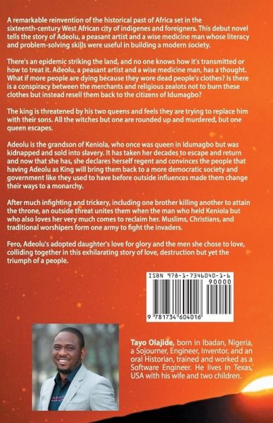 A remarkable reinvention of the historical past of Africa set in the sixteenth-century West African city of indigenes and foreigners. This debut novel tells the story of Adeolu, a peasant artist and a wise medicine man whose literacy and problem-solving skills were useful in building a modern society. There's an epidemic striking the land, and no one knows how it's transmitted or how to treat it. Adeolu, a peasant artist and a wise medicine man, has a thought. What if more people are dying because they wore dead people's clothes? Is there is a conspiracy between the merchants and religious zealots not to burn these clothes but instead resell them back to the citizens of Idumagbo? The king is threatened by his two queens and feels they are trying to replace him with their sons. All the witches but one are rounded up and murdered, but one queen escapes. Adeolu is the grandson of Keniola, who once was queen in Idumagbo but was kidnapped and sold into slavery. It has taken her decades to escape and return and now that she has, she declares herself regent and convinces the people that having Adeolu as King will bring them back to a more democratic society and government like they used to have before outside influences made them change their ways to a monarchy. After much infighting and trickery, including one brother killing another to attain the throne, an outside threat unites them when the man who held Keniola but who also loves her very much comes to reclaim her. Muslims, Christians, and traditional worshipers form one army to fight the invaders. Fero, Adeolu's adopted daughter's love for glory and the men she chose to love, colliding together in this exhilarating story of love, destruction but yet the triumph of a people.