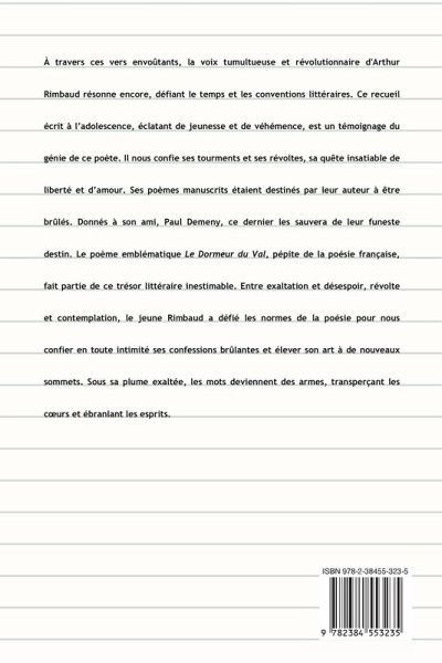 À travers ces vers envoûtants, la voix tumultueuse et révolutionnaire d'Arthur Rimbaud résonne encore, défiant le temps et les conventions littéraires. Ce recueil écrit à l'adolescence, éclatant de jeunesse et de véhémence, est un témoignage du génie de ce poète. Il nous confie ses tourments et ses révoltes, sa quête insatiable de liberté et d'amour. Ses poèmes manuscrits étaient destinés par leur auteur à être brûlés. Donnés à son ami, Paul Demeny, ce dernier les sauvera de leur funeste destin. Le poème emblématique Le Dormeur du Val, pépite de la poésie française, fait partie de ce trésor littéraire inestimable. Entre exaltation et désespoir, révolte et contemplation, le jeune Rimbaud a défié les normes de la poésie pour nous confier en toute intimité ses confessions brûlantes et élever son art à de nouveaux sommets. Sous sa plume exaltée, les mots deviennent des armes, transperçant les c¿urs et ébranlant les esprits.
