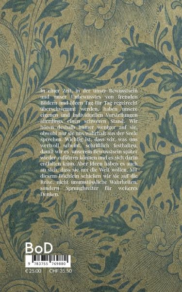 In einer Zeit, in der unser Bewusstsein und unser Unbewusstes von fremden Bildern und Ideen Tag für Tag regelrecht überschwemmt werden, haben unsere eigenen und individuellen Vorstellungen allerdings einen schweren Stand. Wir hören deshalb immer weniger auf sie, obwohl nur sie uns wahrhaft aus der Seele sprechen. Wichtig ist, dass wir, was uns wertvoll scheint, schriftlich festhalten, damit wir es unserem Bewusstsein später wieder zuführen können und es sich darin entfalten kann. Aber Ideen haben es auch an sich, dass sie um die Welt wollen. Mit diesem Büchlein schicken wir sie auf die Reise, nicht unumstössliche Wahrheiten, sondern Sprungbretter für weiteres Denken.