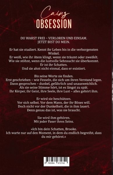 Du warst frei - verloren und einsam.Jetzt bist du mein.Er hat sie studiert. Kennt ihr Leben bis in die verborgensten Winkel.Er weiß, wie ihr Atem klingt, wenn sie träumt oder zweifelt.Wie sie stöhnt, wenn die lustvolle Sehnsucht sie überkommt.Er ist ihr Schatten.Und sie ahnt nicht einmal, dass er existiert.Bis seine Worte sie finden.Erst geschrieben - wie Fesseln, die sich um ihren Verstand legen.Dann gesprochen - dunkel, gefährlich und unausweichlich.Als sie seine Stimme hört, ist es längst zu spät.Ihr Körper, ihr Geist, ihre Seele, ihre Lust - alles gehört ihm.Er wird sie beschützen.Vor sich selbst. Vor dem Mann, der ihr Böses will.Doch nicht vor der Dunkelheit, die in ihm lauert.Denn genau das ist, was sie braucht.Sie wird ihm gehören.Mit jeder Faser ihres Seins.»Ich bin dein Schatten, Brooke.Ich warte nur auf den Moment, in dem du endlich begreifst, dass du mir gehörst.«____Dieser Dark Romance Einzelband enthält explizite Szenen, psychologische Manipulation, toxische Nähe undobsessive Liebe.Düster. Verstörend. Verdammt intensiv.Nicht für zarte Gemüter - und nichts für nebenbei.Was dich erwartetStalker Romance, Obsessive Love, Possessive Hero, Morally Gray Hero, Antihero, Protector Dynamic, Dangerously Attractive, Broken Heroine, The Only One