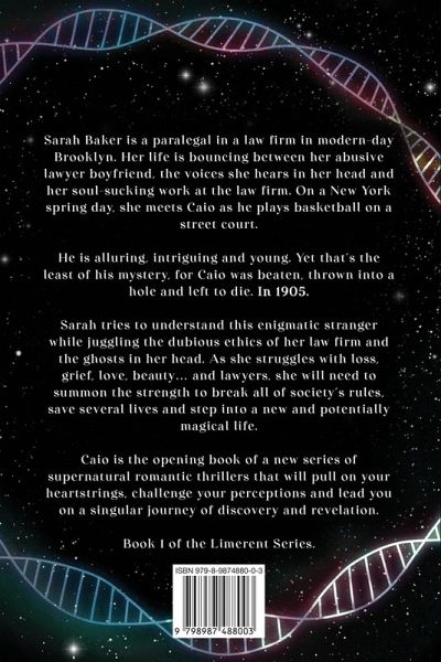 Sarah Baker is a paralegal in a law firm in modern-day Brooklyn. Her life is bouncing between her abusive lawyer boyfriend, the voices she hears in her head and her soul-sucking work at the law firm. On a New York spring day, she meets Caio as he plays basketball on a street court. He is alluring, intriguing and young. Yet that's the least of his mystery, for Caio was beaten, thrown into a hole and left to die. In 1905. Sarah tries to understand this enigmatic stranger while juggling the dubious ethics of her law firm and the ghosts in her head. As she struggles with loss, grief, love, beauty... and lawyers, she will need to summon the strength to break all of society's rules, save several lives and step into a new and potentially magical life. Caio is the opening book of a new series of supernatural romantic thrillers that will pull on your heartstrings, challenge your perceptions and lead you on a singular journey of discovery and revelation. Book 1 of the Limerent Series.
