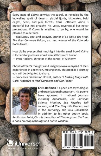 Every page of Cairns conveys the sacral, as revealed by the indwelling spirit of deserts, glacial fjords, kitti wakes, bald eagles, bears, and pine forests. Chris Hoffman's vision is prayerful but not preachy. His voice, reverential but never pretentious. If Cairns is anything to go by, one would be pleased to meet him. - Reg Saner, poet and essayist, author of So This is the Map, The Four-Cornered Falcon, etc. and winner of the Colorado Book Award How did he ever get that much light into this small book? Cairns is the kind of joy bears would want if they were human. - Evan Hodkins, Director of the School of Alchemy Chris Hoff man's thoughts and imagery evoke a myriad of life's experiences in a few rich, moving lines. This book is a journey you will be delighted to share. - Francesca Ciancimino Howell, author of Making Magic with Gaia: Practices to Heal Ourselves and Our Planet