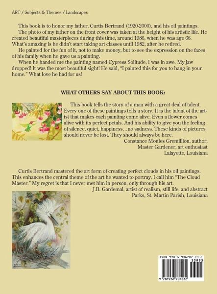 This book is to honor my father, Curtis Bertrand (1920-2000), and his oil paintings. The photo of my father on the front cover was taken at the height of his artistic life. He created beautiful masterpieces during this time, around 1986, when he was age 66. What's amazing is he didn't start taking art classes until 1982, after he retired. He painted for the fun of it, not to make money, but to see the expression on the faces of his family when he gave us a painting. When he handed me the painting named Cypress Solitude, I was in awe. My jaw dropped! It was the most beautiful sight! He said, "I painted this for you to hang in your home." What love he had for us!