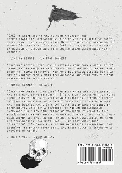 "CAKE is alive and crackling with absurdity and unpredictability, operating at a speed and on a scale we don't often find. Like a contemporary Dadaist experiment revealing the doomed 21st century to itself, CAKE is a daring and irreverent expression of discontent, with subterranean seriousness and wisdom." - Lindsay Lerman, I'm From Nowhere "Cake has better mixed medium literary work than a group of MFA grads, better speculative/futurist anti-capitalist theory than a group of Thomas Piketty's, and more believable elegies for what may be wrought from a dead technological age than even the most heartbroken of modern cynics." - Robert Lashley, Up South "Cake! Who doesn't like cake? The best cakes are multilayered, and this cake is no different. It's a rich mélange of rich nutty humor, creamy fugues of vertiginous erudition, generous thrusts of tangy provocation, rich swirly comedies of toasted coconut and pure Dada extract. It's got songs and dreams and sinister experiments. It's got a seasoned wit and an unseasonable "wormwood sun." How many things go wonderfully wrong in this book? As many things that go wonderfully right, and taste like a lush creamy sentence on the tongue, a wavy oscillation of chaos and strawberries. You know what I like best about this collection? It's chock full of the madness of imagination, the light of the bakery never dims, and every slice is served on a universe of words." - John Olson, Larynx Galaxy