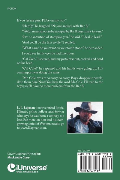 If you let me pass, I'll be on my way." "Hardly." he laughed, "No one messes with Bar B." "Well, I'm not about to be stomped by Bar B boys, that's for sure." "I've no intention of stomping you." he said. "I deal in lead." "And you'll be the first to die." I replied. "What name do you want on your tomb stone?" he demanded. I could see in his eyes he had intention. "Cal Cole." I sneered, and my pistol was out, cocked, and dead on his head. "Cal Cole?" he repeated and his hands were going up. His counterpart was doing the same. "Mr. Cole, we are so sorry, so sorry. Boys, drop your pistols, drop them now. Now! You have the road Mr. Cole. I'll tend to the boys; you'll have no more problem from the Bar B.