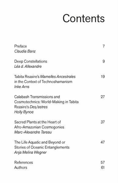 Five authors provide contributions from their respective fields to this project: artist Léa d. Allexandre, curator Inke Arns, environmental activist and writer Holly Bynoe, ethnobotanist Marc-Alexandre Tareau, and marine biologist and behavioural scientist Anja Wegner. Their texts open multi-layered approaches to Rezaire's work and allow us to experience the productive ways in which knowledge, practice, and aesthetics intersect.