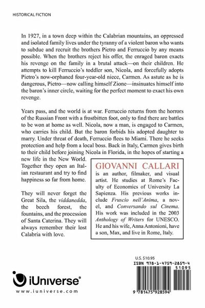 In 1927, in a town deep within the Calabrian mountains, an oppressed and isolated family lives under the tyranny of a violent baron who wants to subdue and recruit the brothers Pietro and Ferruccio by any means possible. When the brothers reject his offer, the enraged baron exacts his revenge on the family in a brutal attack-on their children. He attempts to kill Ferruccio's toddler son, Nicola, and forcefully adopts Pietro's now-orphaned four-year-old niece, Carmen. As astute as he is dangerous, Pietro-now calling himself Zione-insinuates himself into the baron's inner circle, waiting for the perfect moment to exact his own revenge. Years pass, and the world is at war. Ferruccio returns from the horrors of the Russian Front with a frostbitten foot, only to find there are battles to be won at home as well. Nicola, now a man, is engaged to Carmen, who carries his child. But the baron forbids his adopted daughter to marry. Under threat of death, Ferruccio flees to Miami. There he seeks protection and help from a local boss. Back in Italy, Carmen gives birth to their child before joining Nicola in Florida, in the hopes of starting a new life in the New World. Together they open an Italian restaurant and try to find happiness so far from home. They will never forget the Great Sila, the viddanedda, the beech forest, the fountains, and the procession of Santa Caterina. They will always remember their lost Calabria with love.