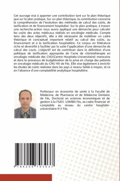 Cet ouvrage vise à apporter une contribution tant sur le plan théorique que sur le plan pratique. Sur un plan théorique, la contribution concerne la compréhension de l'évolution des méthodes de calcul des coûts, de tarification et de financement hospitalier. Sur le plan pratique, à travers une recherche-action nous avons appliqué une démarche pour calculer les coûts des actes médicaux réalisés en oncologie médicale. Compte tenu des deux objectifs, elle a été nécessaire de mobiliser un cadre théorique et conceptuel important relatif au calcul des coûts, au financement et à la tarification hospitalière. Ce corpus en littérature riche et diversifié à faciliter par la suite l'application d'une démarche de calcul des couts. L'objectif est de contribuer dans la définition d'une politique de tarification appropriée de l'acte de chimiothérapie en oncologie médicale des CHU(Centre Hospitalo-Universitaire) marocains et dans le processus de budgétisation de la prise en charge des patients en oncologie médicale du CHU HII de Fès. Elle vise également à enrichir les études de coûts réalisées dans les pays à revenu faible à moyen, et ce en l'absence d'une comptabilité analytique hospitalière.