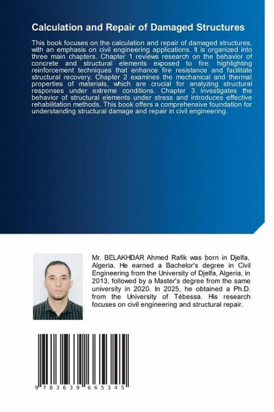 This book focuses on the calculation and repair of damaged structures, with an emphasis on civil engineering applications. It is organized into three main chapters. Chapter 1 reviews research on the behavior of concrete and structural elements exposed to fire, highlighting reinforcement techniques that enhance fire resistance and facilitate structural recovery. Chapter 2 examines the mechanical and thermal properties of materials, which are crucial for analyzing structural responses under extreme conditions. Chapter 3 investigates the behavior of structural elements under stress and introduces effective rehabilitation methods. This book offers a comprehensive foundation for understanding structural damage and repair in civil engineering.