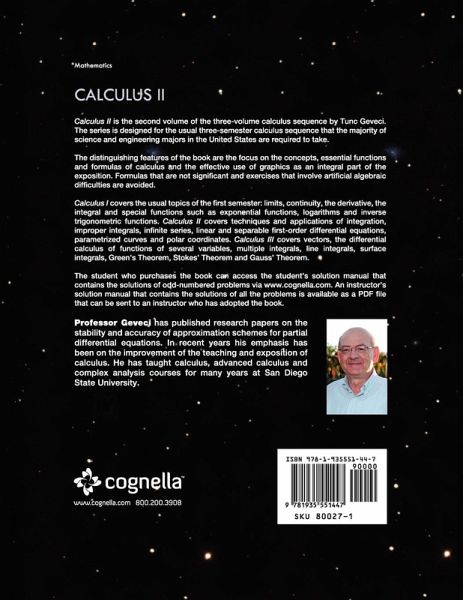 Calculus II is the second volume of the three-volume calculus sequence by Tunc Geveci. The series is designed for the usual three-semester calculus sequence that the majority of science and engineering majors in the United States are required to take. The distinguishing features of the book are the focus on the concepts, essential functions and formulas of calculus and the effective use of graphics as an integral part of the exposition. Formulas that are not significant and exercises that involve artificial algebraic difficulties are avoided. The three-volume calculus sequence is organized as follows: * Calculus I covers the usual topics of the first semester: limits, continuity, the derivative, the integral and special functions such as exponential functions, logarithms and inverse trigonometric functions. * Calculus II covers techniques and applications of integration, improper integrals, infinite series, linear and separable first-order differential equations, parametrized curves and polar coordinates. * Calculus III covers vectors, the differential calculus of functions of several variables, multiple integrals, line integrals, surface integrals, Green's Theorem, Stokes' Theorem and Gauss' Theorem.