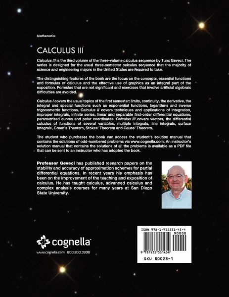 Calculus III is the third and final volume of the three-volume calculus sequence by Tunc Geveci. The series is designed for the usual three-semester calculus sequence that the majority of science and engineering majors in the United States are required to take. The distinguishing features of the book are the focus on the concepts, essential functions and formulas of calculus and the effective use of graphics as an integral part of the exposition. Formulas that are not significant and exercises that involve artificial algebraic difficulties are avoided. The three-volume calculus sequence is organized as follows: * Calculus I covers the usual topics of the first semester: limits, continuity, the derivative, the integral and special functions such as exponential functions, logarithms and inverse trigonometric functions. * Calculus II covers techniques and applications of integration, improper integrals, infinite series, linear and separable first-order differential equations, parametrized curves and polar coordinates. * Calculus III covers vectors, the differential calculus of functions of several variables, multiple integrals, line integrals, surface integrals, Green's Theorem, Stokes' Theorem and Gauss' Theorem.