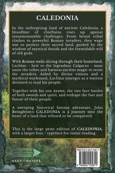 In the unforgiving land of ancient Caledonia, a bloodline of chieftains rises up against insurmountable challenges. From brutal tribal clashes to powerful Roman invaders, they wage war to protect their sacred land, guided by the wisdom of mystical druids and the formidable will of old gods. With Roman walls slicing through their homeland, Lachlan - heir to the legendary Calgacus - must unite the tribes and harness ancient magic to resist the invaders. Aided by divine visions and a mythical warhound, Lachlan emerges as a warrior destined to lead his people. Together with his son Arawn, the two face battles of both swords and spirit, and reshape the fate and future of their people. A sweeping historical fantasy adventure, John Broughton's CALEDONIA is a journey into the heart of a land that refused to be conquered. This is the large print edition of Caledonia, with a larger font / typeface for easier reading.