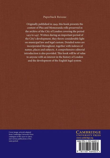 Originally published in 1943, this book presents the content of Plea and Memoranda rolls preserved in the archive of the City of London covering the period 1413 to 1437. Written during an important period of the City's development, they throw considerable light on municipal law and legal custom. Detailed notes are incorporated throughout, together with indexes of names, places and subjects. A comprehensive editorial introduction is also provided. This book will be of value to anyone with an interest in the history of London and the development of the English legal system.